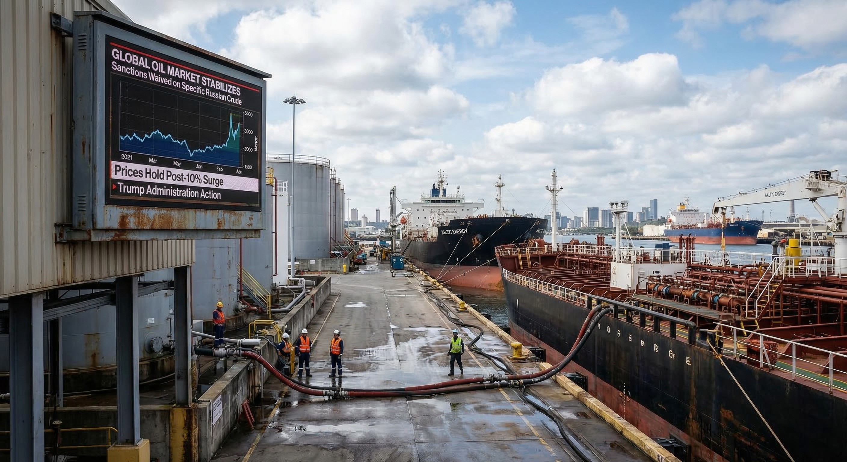 Oil prices remained stable after President Trump waived sanctions on certain Russian crude sales, following a prior surge of 10%.
